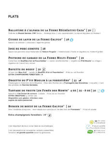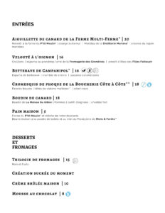 Notre approvisionnement se fait majoritairement auprès de petits fournisseurs locaux et malgré nos efforts pour nous assurer de la disponibilité des produits à notre menu, prenez note qu’il est possible que certains éléments du menu décrit ci-bas puissent différer de celui en salle à manger. De même, les photos sont à titre indicatif seulement.