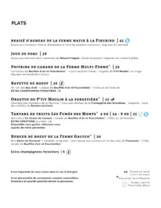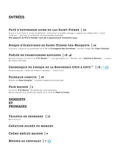 Notre approvisionnement se fait majoritairement auprès de petits fournisseurs locaux et malgré nos efforts pour nous assurer de la disponibilité des produits à notre menu, prenez note qu’il est possible que certains éléments du menu décrit ci-bas puissent différer de celui en salle à manger.