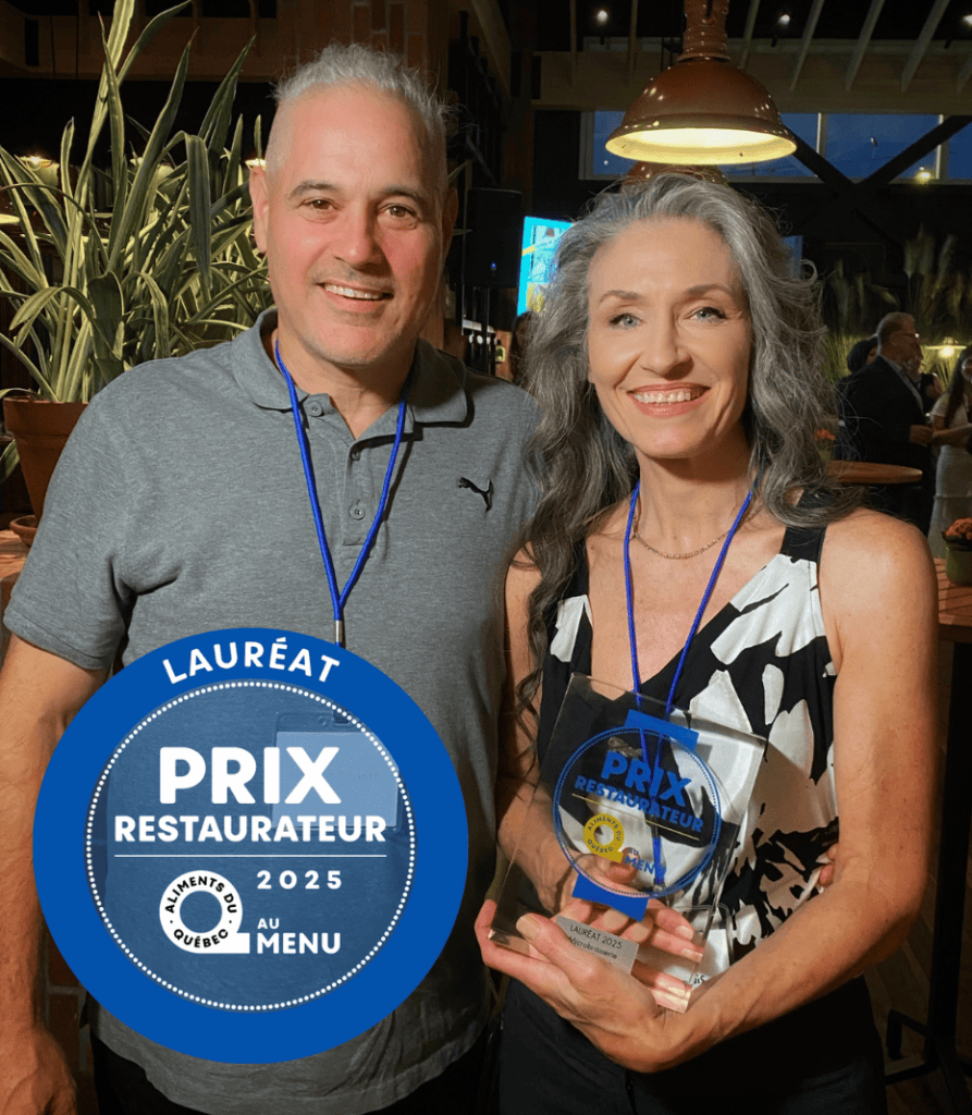 Émotion et fierté au rendez-vous! Isabelle et Francis reçoivent le Prix restaurateur Aliments du Québec au menu 2025, accompagnés de leur fille Roseline et de son conjoint Adam, qui font partie de l’équipe en cuisine et au service du Presbytère. Une belle célébration d’un engagement familial et passionné envers les aliments du Québec.